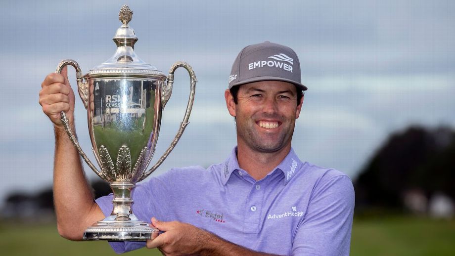 Robert Streb posa con el trofeo del RSM Classic de golf.